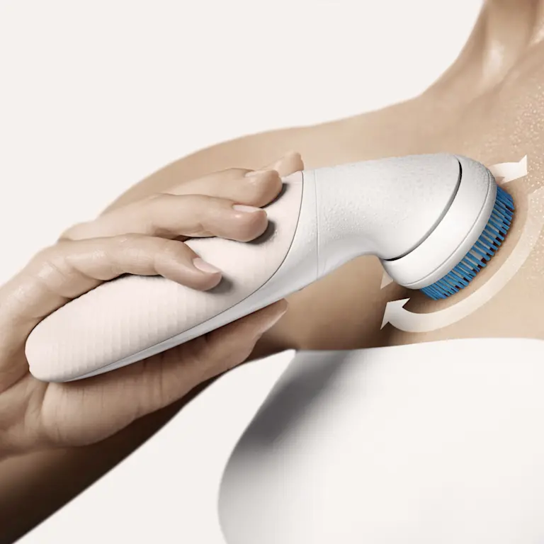 Gebruik het exfoliatiehoofd om ingegroeide haartjes te voorkomen. De scrubborstel maakt je huid glad en stralend.